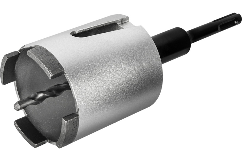 Охлаждение водой увеличивает ресурс. Оснащена центрирующим сверлом 6.5 мм и хвостовиком SDS Plus.