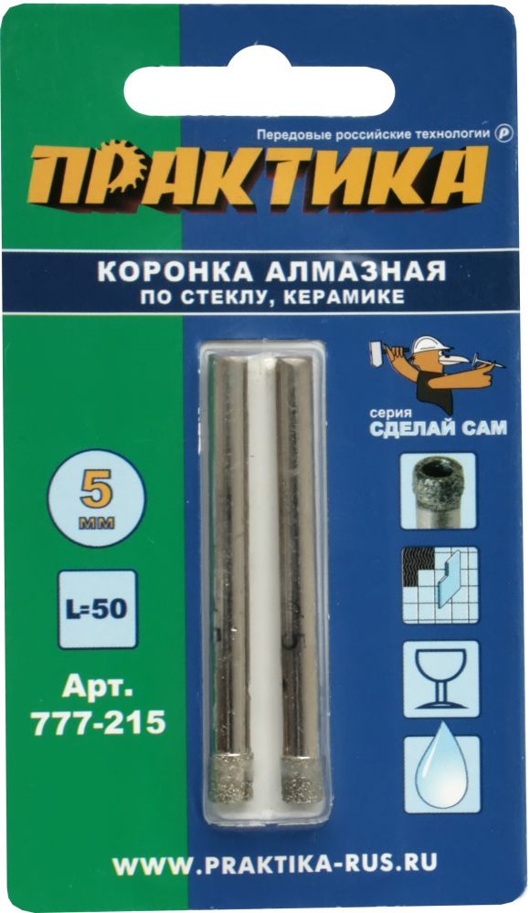Коронка алмазная ПРАКТИКА ".Сделай сам" по стеклу и керамике 5мм (2шт) блистер *