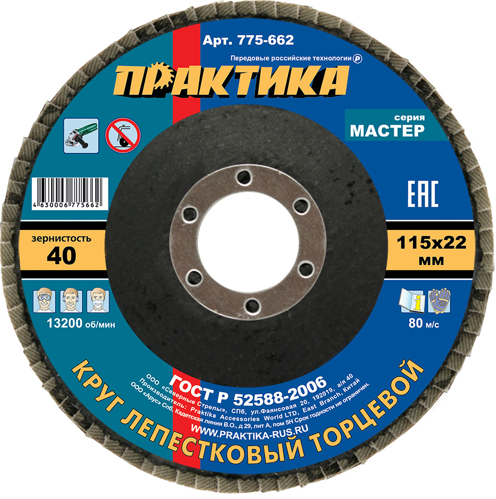 Круг лепестковый шлифовальный ПРАКТИКА 115 х 22 мм Р 40 (1шт.) , серия Мастер