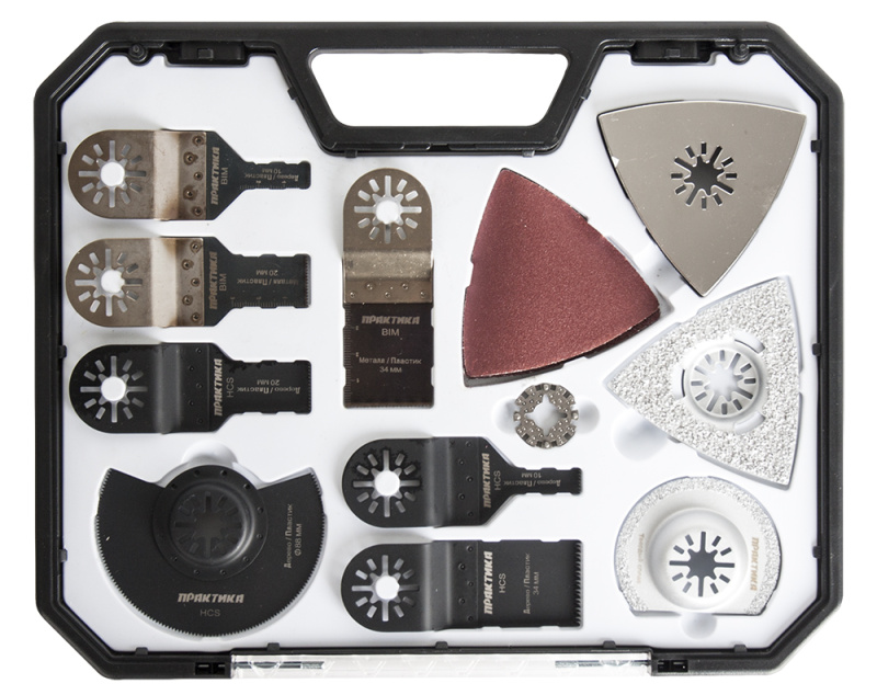 Набор содержит 15 насадок позволяющие производить следующие виды работ: выборка пазов для установки замков и фурнитуры, подрезание внутренних углов, вырезание различных проемов в листовых материалах под провода, трубы, люки, электро-установочные изделия, резка плинтусов, наличников, металлических и пластиковых труб и профилей, обрезка гвоздей заподлицо с поверхностью, подрезание облицовки стен и наличников заподлицо при укладке паркетной доски, подрезка и шлифовка плитки, обработка швов между плитками, зачистка клея, шпатлевки, шлифовка деревянных и металлических изделий.
