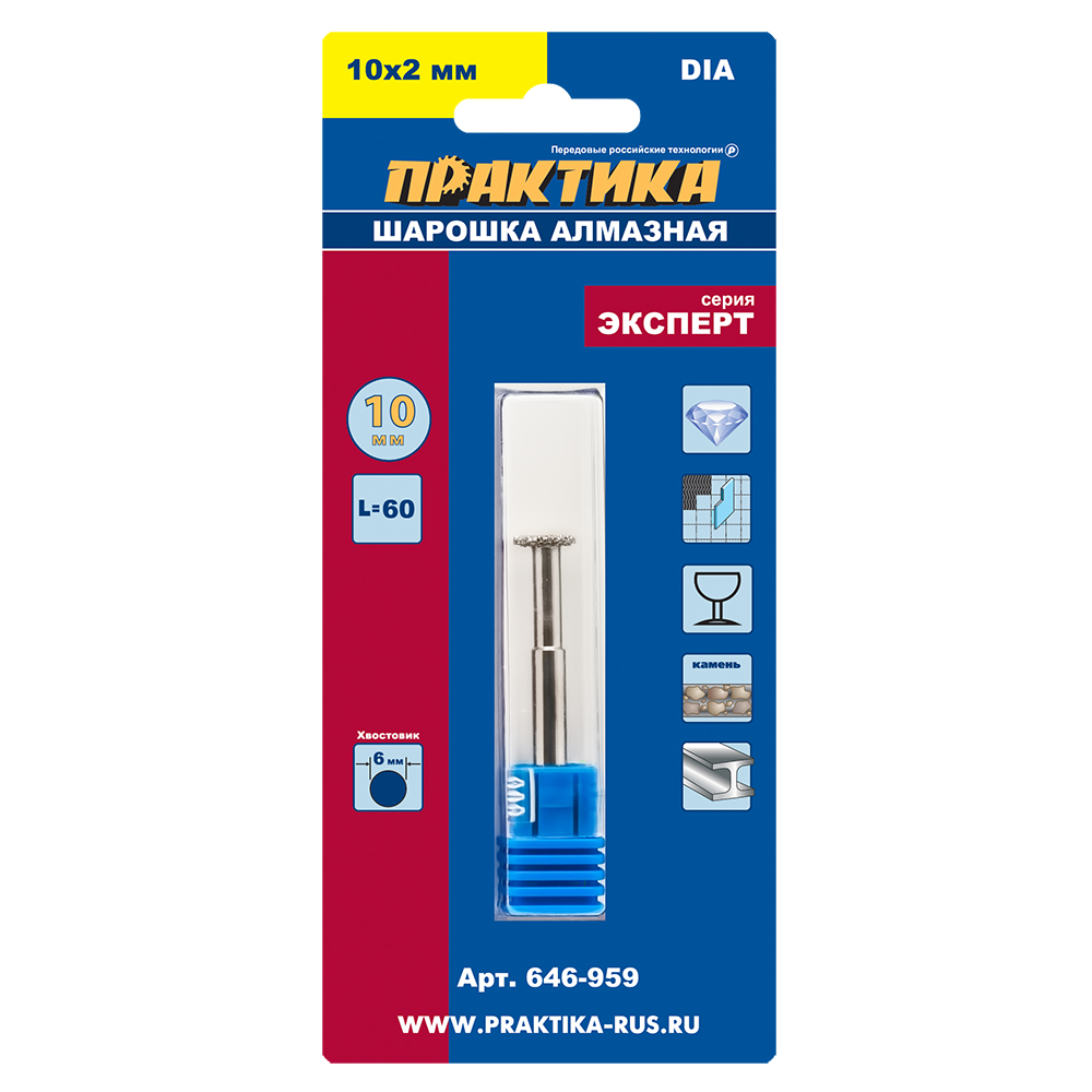 Шарошка алмазная ПРАКТИКА дисковая 10 х 2 мм, длина 60 мм, хвост 6 мм