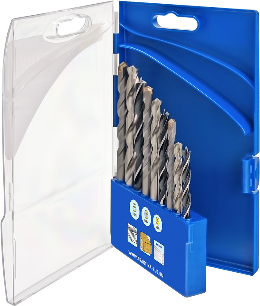 В набор ПРАКТИКА "Профи" 640-384 входят 9 сверл, которые можно использовать и для обработки деревянных поверхностей, и металлических, и бетонных. В связи с этим инструменты в наборе делятся на 3 категории. Изделия имеют диаметр, равный 5, 6 и 8 мм. Для изготовления сверл по металлу использовалась быстрорежущая сталь, по дереву – высокопрочная углеродистая сталь, а для бетона, камня и кирпича – твердые сплавы стали.