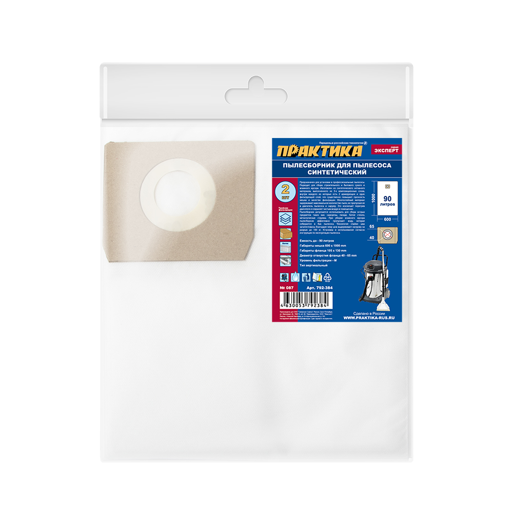 Мешок для пылесоса ПРАКТИКА № 087 для SOTECO, STANLEY, LAVOR и др.,до 90 л., синтетический, уп. 2 шт