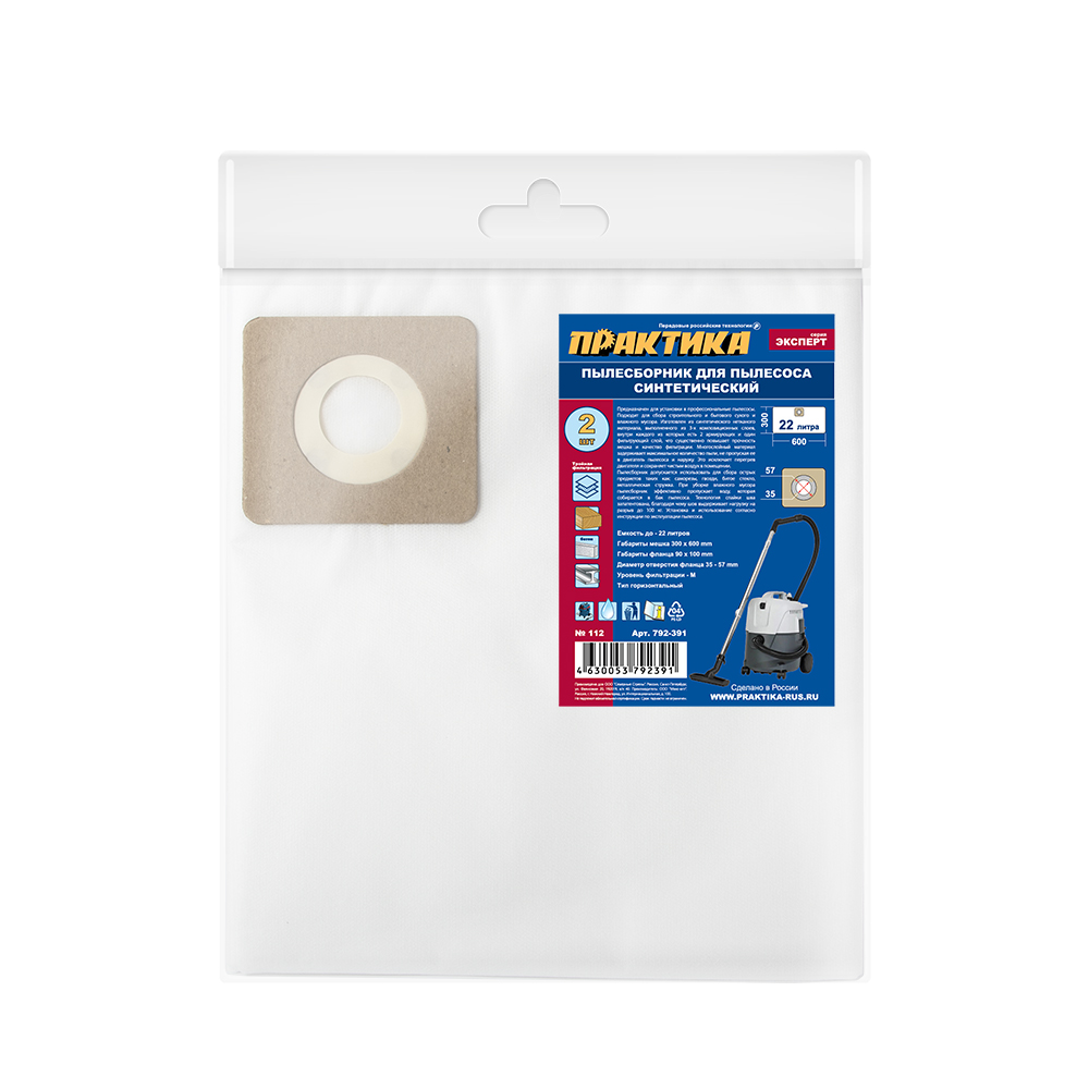 Мешок для пылесоса ПРАКТИКА № 112 для EDON, ДИОЛД, ЗУБР и др.,до 22 л., синтетический, уп. 2 шт.