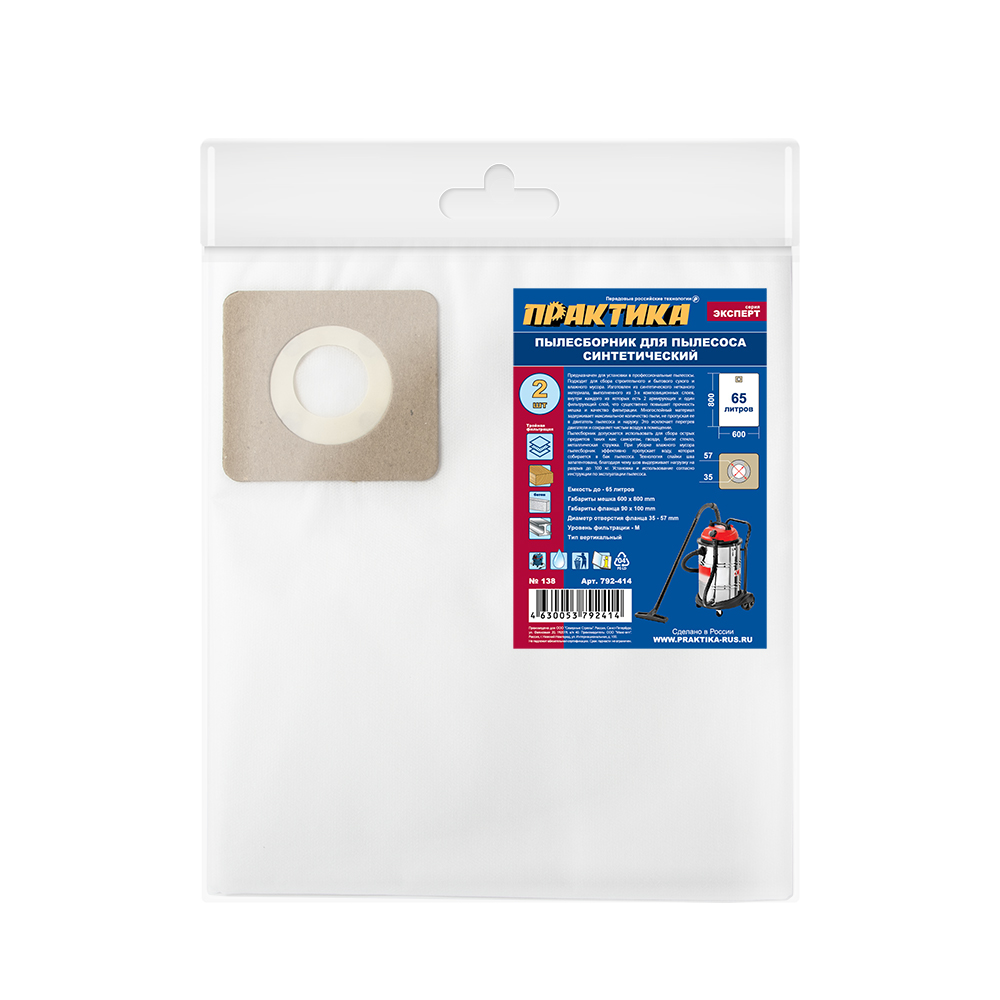 Мешок для пылесоса ПРАКТИКА № 138 для REDVERG, ЗУБР, КАЛИБР и др.,до 65 л., синтетический, уп. 2 шт.