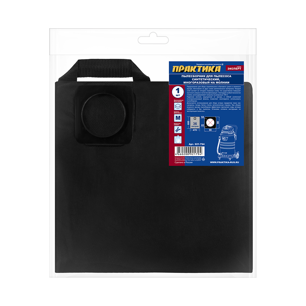 Мешок ПРАКТИКА для пылесосов MAKITA 440, NILFISK, RUPES и др., до 36л, МНОГОРАЗОВЫЙ, синтетика, 1шт.