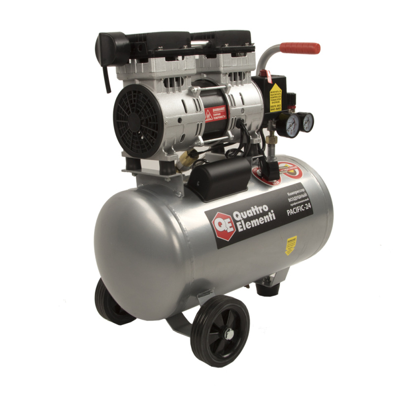 Кроме показателя низкого уровня звука, компрессор поршневой безмасляный QUATTRO ELEMENTI PACIFIC-24 отличает от большинства пневмокомпрессоров то, что в его работе не требуется заправка масла в двигатель – он безмасляный, т.е. обслуживание пневмокомпрессора минимально. Этот компрессор найдет свое назначение в тех областях, где действует регламент на показатели уровня шума, например в медучреждениях. В бытовых, повседневных условиях, работа с этим пневмокомпрессором доставит только удовольствие - он не раздражает шумом и довольно компактен, занимает мало места, снабжен колесами и рукояткой для комфортного перемещения пневмокомпрессора.