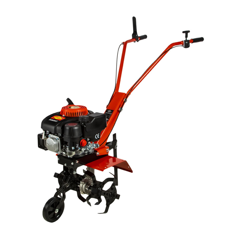 Модель оснащена бензиновым 4-х тактным двигателем мощностью 5 л.с. Перемещение культиватора от места хранения до участка облегчено благодаря транспортировочному колесу.