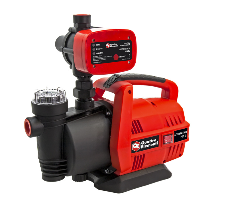Автоматическая насосная станция Quattro Elementi Automatico 700EL предназначена для перекачивания чистой воды, не содержащей песка, грязи, абразивных частиц, волокнистых включений и любых иных загрязнений. Обеспечивает автоматическое бесперебойное снабжение водой. Идеально подходит для водоснабжения дач, домов и частных домохозяйств из колодцев, скважин и других источников чистой воды с глубины не более 8 метров. Автоматическая станция водоснабжения Automatico 700 EL состоит из электрического двигателя, насосной части, гидравлической арматуры, блока автоматики, фильтра грубой очистки.Отсуствие гидроаккумулятора делает эту станцию проще,компактнее и дешевле.
