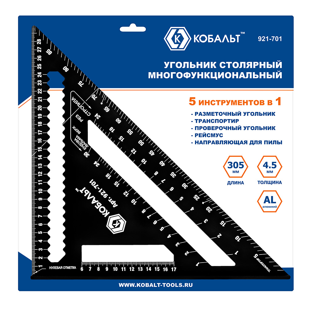 Угольник КОБАЛЬТ столярный многофункциональный, 305 мм, толщина 4.5 мм, алюминиевый, анод. покрытие