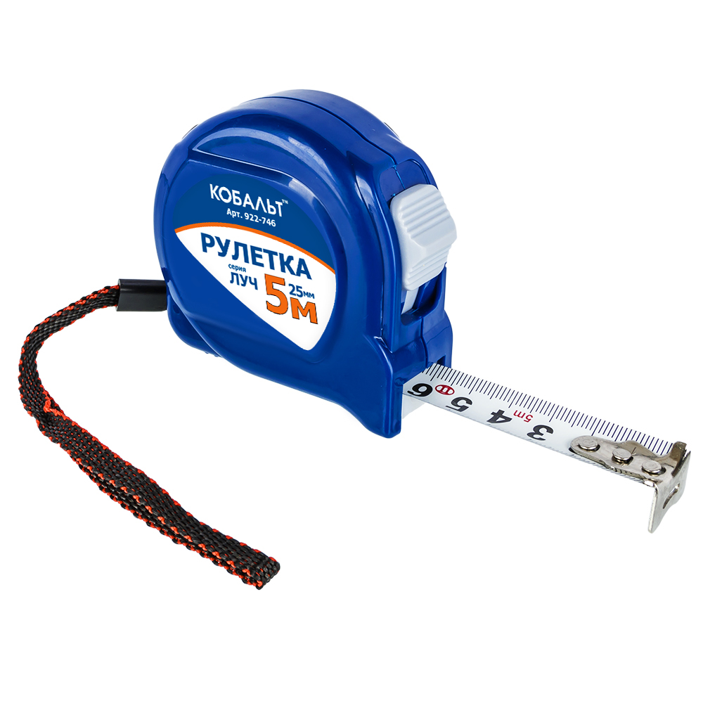 Рулетка КОБАЛЬТ Луч 5м x 25мм, корпус из ABS пластика, мех.стопор, белое мат. покрытие.