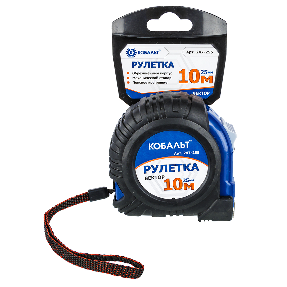 Рулетка КОБАЛЬТ Вектор 10м x 25мм обрезиненный корпус (мех.стопор, белое матов. покрытие,) 1/6