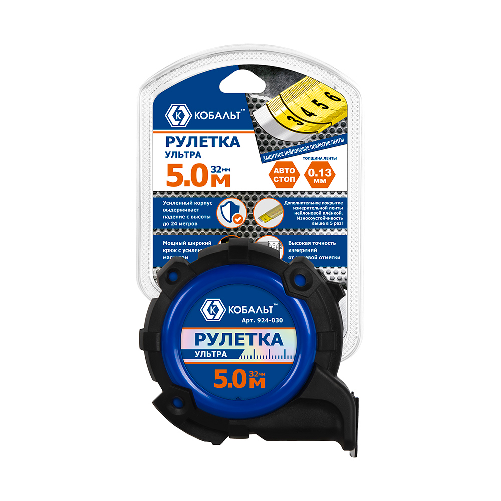 Рулетка КОБАЛЬТ УЛЬТРА 5м х 32мм, обрезиненный корпус, нейл. покр. ленты 0.13 мм, широкий магнит