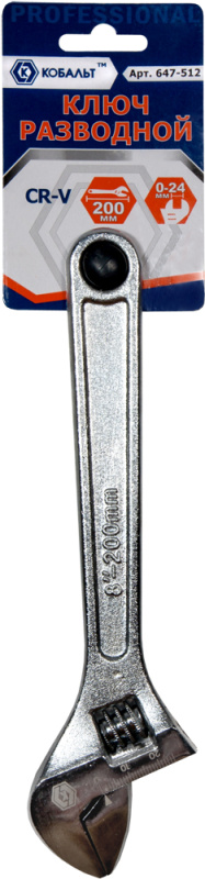 Ключ разводной КОБАЛЬТ 200 мм, ширина захвата 24 мм, CR-V (1 шт.) блистер 1/6
