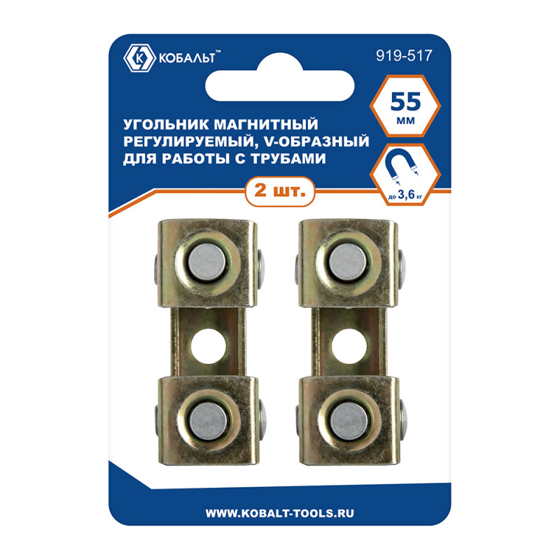 Угольник магнитный КОБАЛЬТ 55 мм, V-ОБРАЗНЫЙ,регулируемый, для работы с трубами,магнит до 3,6 кг.2шт