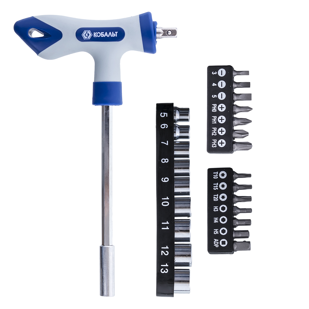 Отвертка рукоятка КОБАЛЬТ Т-образная с набором бит и торцевых головок 1/4", CR-V (24 шт.) блистер
