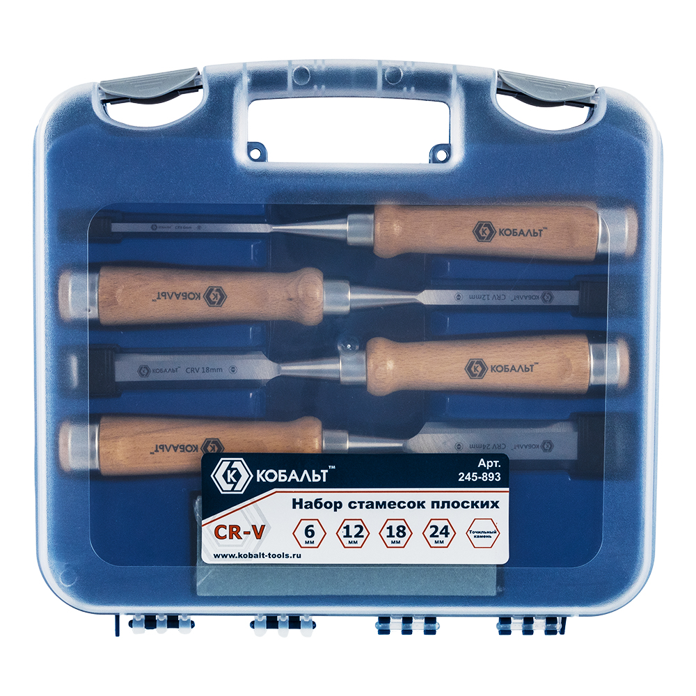 Набор стамесок КОБАЛЬТ плоских: 6, 12, 18, 24 х 140 мм, CR-V, деревянная рукоятка, точильн. камень (
