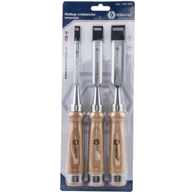 Набор стамесок КОБАЛЬТ плоских: 8, 16, 22 х 140 мм, CR-V, двухкомпонентная рукоятка, точильн. камень
