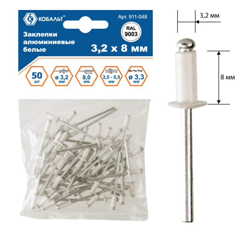 Заклепки КОБАЛЬТ алюминиевые, 3,2 х 8 мм, белые RAL 9003 (50 шт.) пакет