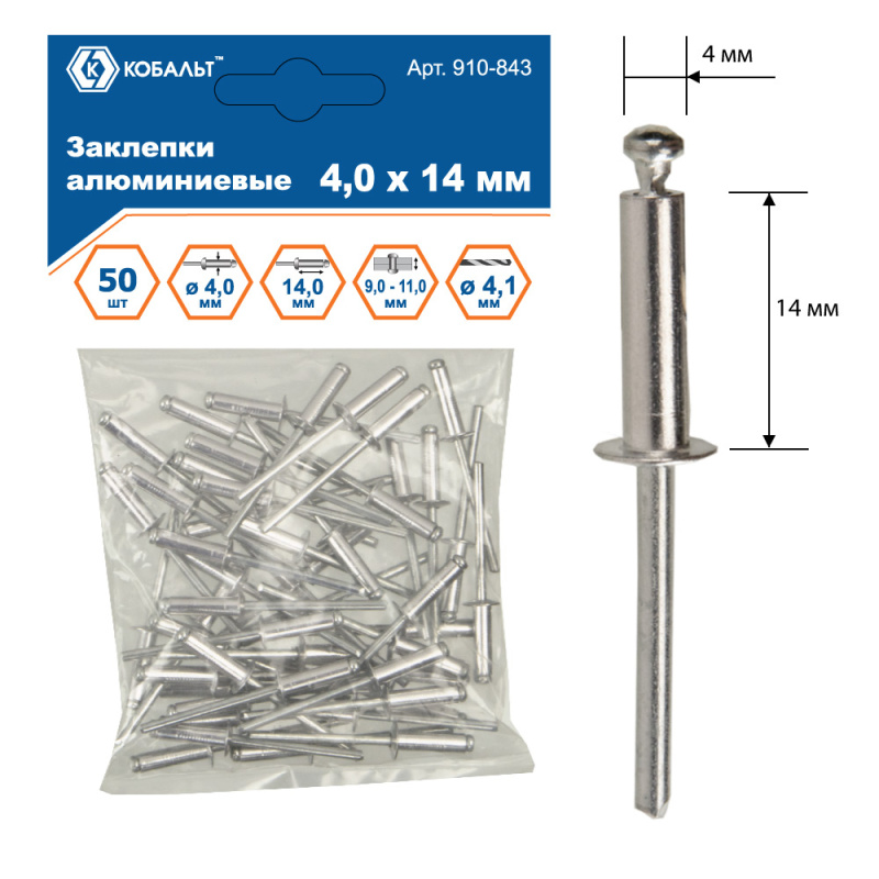 Заклепки КОБАЛЬТ алюминиевые, 4,0 х 14 мм (50 шт.) пакет