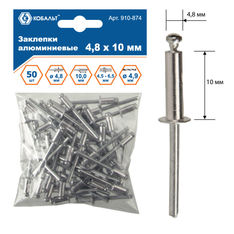 Заклепки КОБАЛЬТ алюминиевые, 4,8 х 10 мм (50 шт.) пакет