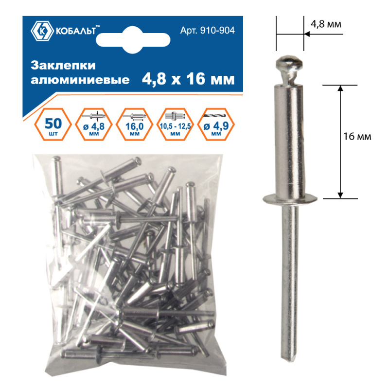 Заклепки КОБАЛЬТ алюминиевые, 4,8 х 16 мм (50 шт.) пакет