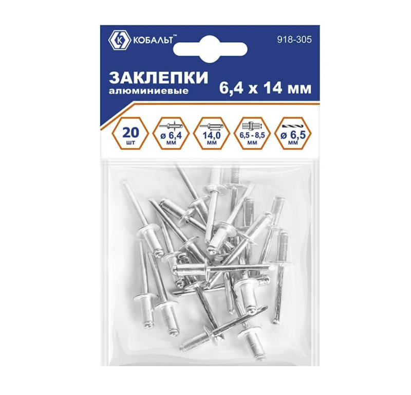 Заклепки вытяжные КОБАЛЬТ алюминиевые, 6,4 х 14 мм (20 шт.) пакет (918-305)